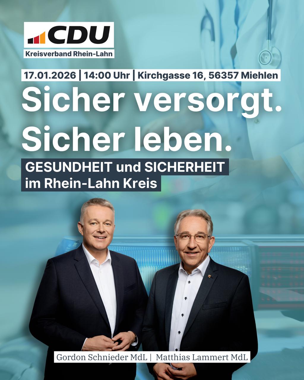 Die CDU Rhein-Lahn lädt am Samstag, 17. Januar 2026, um 14:00 Uhr zu einer öffentlichen Veranstaltung zum Thema „Gesundheit und Sicherheit im Rhein-Lahn-Kreis“ ein. Veranstaltungsort das evangelische Gemeindehaus (Kirchgasse 16) in Miehlen.
