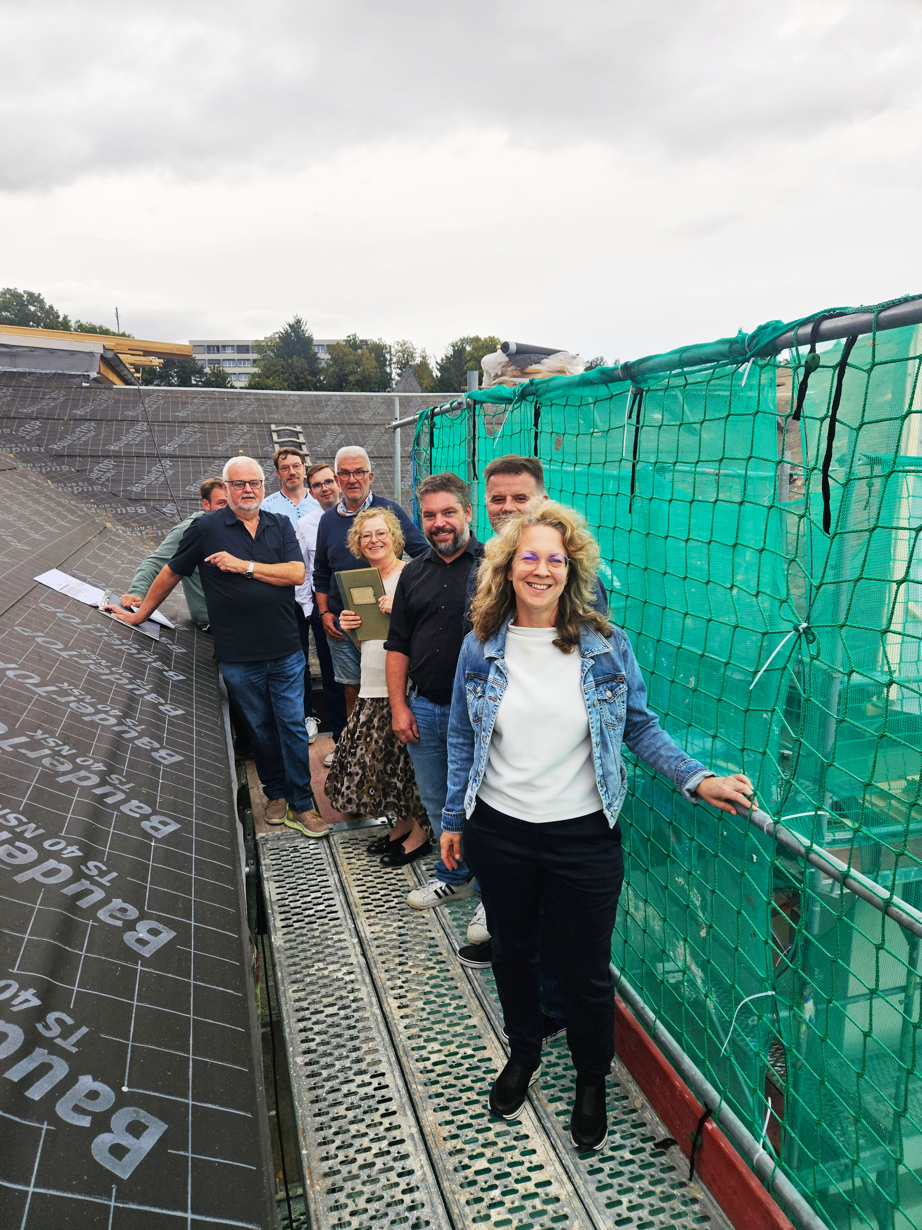 Gemeinsam mit den Mitarbeitern der Verbandsgemeindeverwaltung, Angela Michel und Eike Schrobiltgen, ging es zunächst über das große Außengerüst hinauf auf das Dach des Gebäudes. Dort erläuterten die Fachleute die laufenden Maßnahmen: „Das Dach des Verwaltungsgebäudes wird derzeit umfassend energetisch saniert und neu eingedeckt. Ein weiterer Schwerpunkt liegt auf der nachhaltigen Energieversorgung“, sagt Eike Schrobiltgen. Im Zuge der Arbeiten wird ebenfalls eine Photovoltaikanlage sowie ein großer Speicher mit einer Kapazität von rund 40 Kilowattstunden installiert. Beide Maßnahmen kosten insgesamt 417.000 Euro und die Finanzierung erfolgt vollständig über das Kommunale Investitionsprogramm für Klimaschutz und Innovation Landes Rheinland-Pfalz. Die Fertigstellung ist für Mitte November geplant.